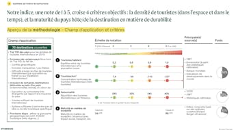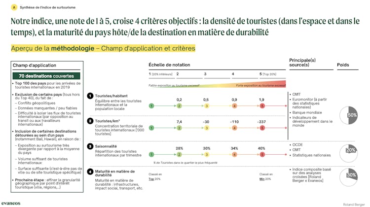 Pour mesurer leur degré d’exposition au surtourisme, chaque destination est notée de 1 à 5 en croisant quatre critères objectifs : la densité de touristes par habitant, la densité de touristes par Km2, la saisonnalité, ainsi que la maturité du pays hôte en matière de durabilité. Ce dernier critère d’évaluation prend en compte l’impact social du tourisme, l’état des infrastructures d’accueil ou encore le développement des transports…