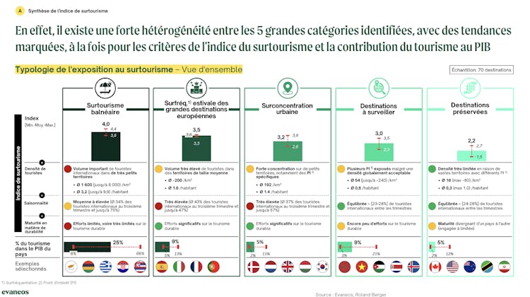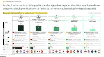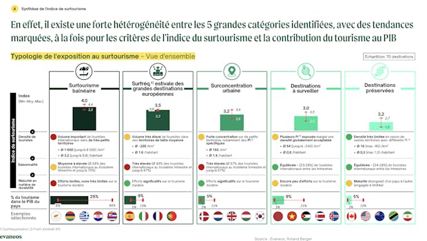 Parmi les destinations étudiées, l'impact du surtourisme varie selon 3 grands types d’exposition. Ainsi, le surtourisme balnéaire, la surfréquentation estivale desgrandes destinations européennes, la surconcentration urbaine sont les trois catégories à risque identifiées par l’index. A cela s'ajoutent les destinations “à surveiller” qui nécessitent la mise en place d’actions préventives et celles qui sont encore préservées du tourisme de masse.
