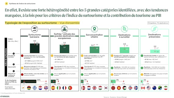 Le surtourisme est aujourd'hui l’un des enjeux majeurs auquel le secteur fait face. De quoi s'agit-il ? Définit par une croissance excessive du nombre de visiteurs sur un territoire donné, le surtourisme a des effets indéniables - des espaces naturels endommagés, un temps d’attente interminable pour visiter des sites historiques, une qualité de vie dégradée pour les populations locales, une expérience voyageur détériorée, mais qui sont difficilement mesurables. Dépasser les impressions et permettre une approche objective, telle est l'ambition du premier Index du surtourisme élaboré par Evaneos et le cabinet de conseil Roland Berger. Cet index propose des typologies de surtourisme en s'appuyant sur l’analyse d’un échantillon de 70 destinations parmi les 100 principales en termes d’affluence.
