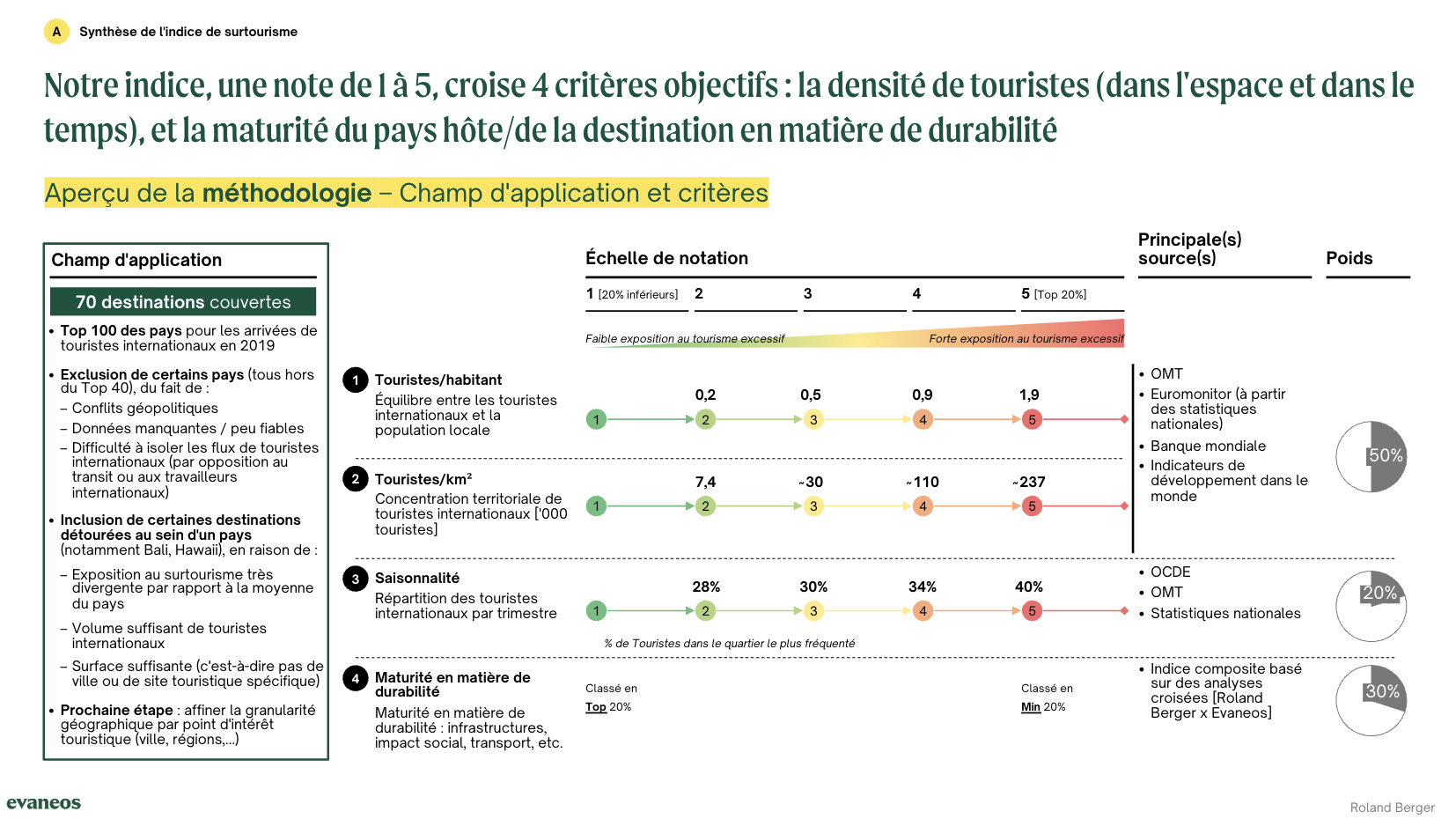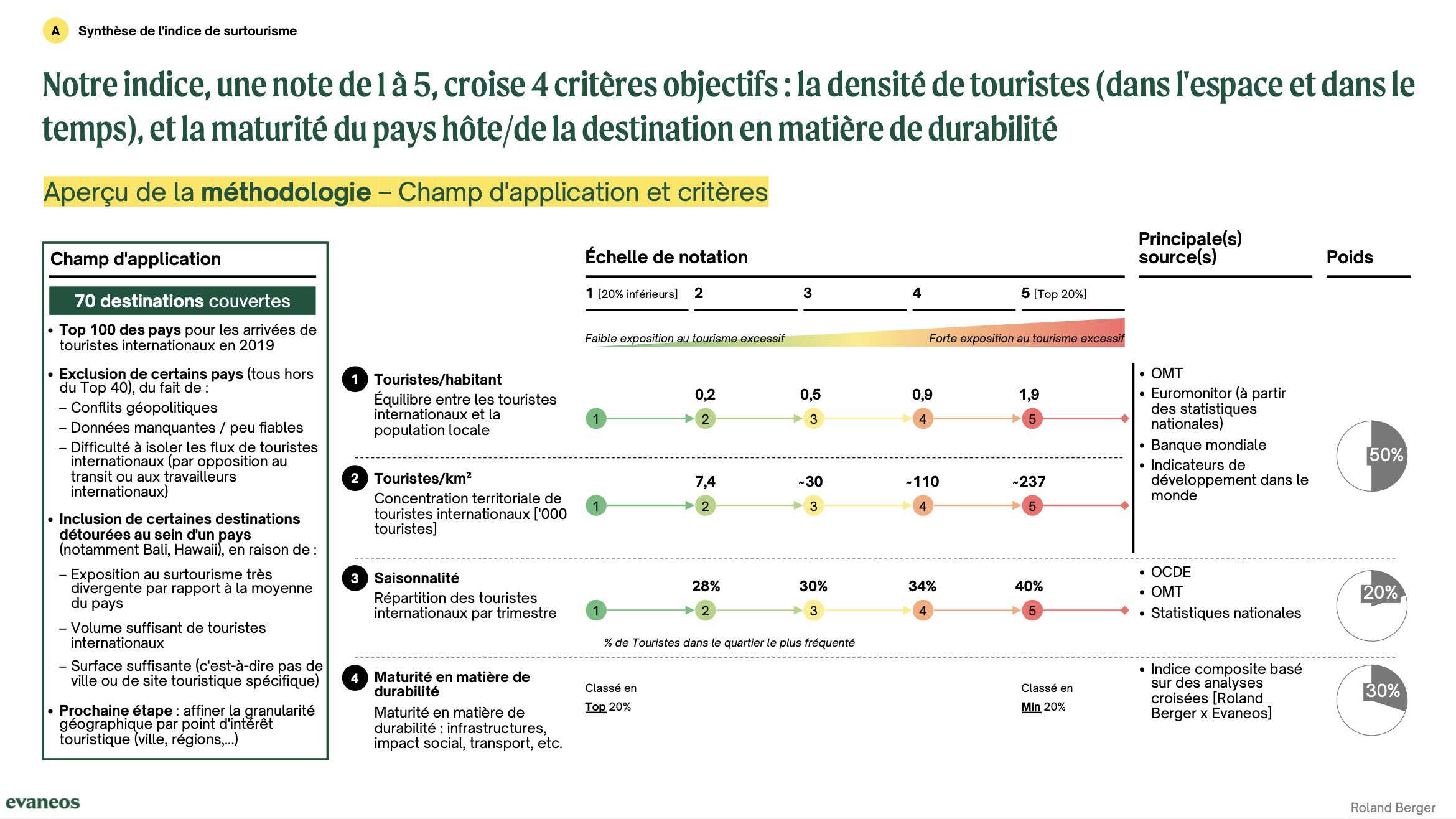 Pour mesurer leur degré d’exposition au surtourisme, chaque destination est notée de 1 à 5 en croisant quatre critères objectifs : la densité de touristes par habitant, la densité de touristes par Km2, la saisonnalité, ainsi que la maturité du pays hôte en matière de durabilité. Ce dernier critère d’évaluation prend en compte l’impact social du tourisme, l’état des infrastructures d’accueil ou encore le développement des transports…