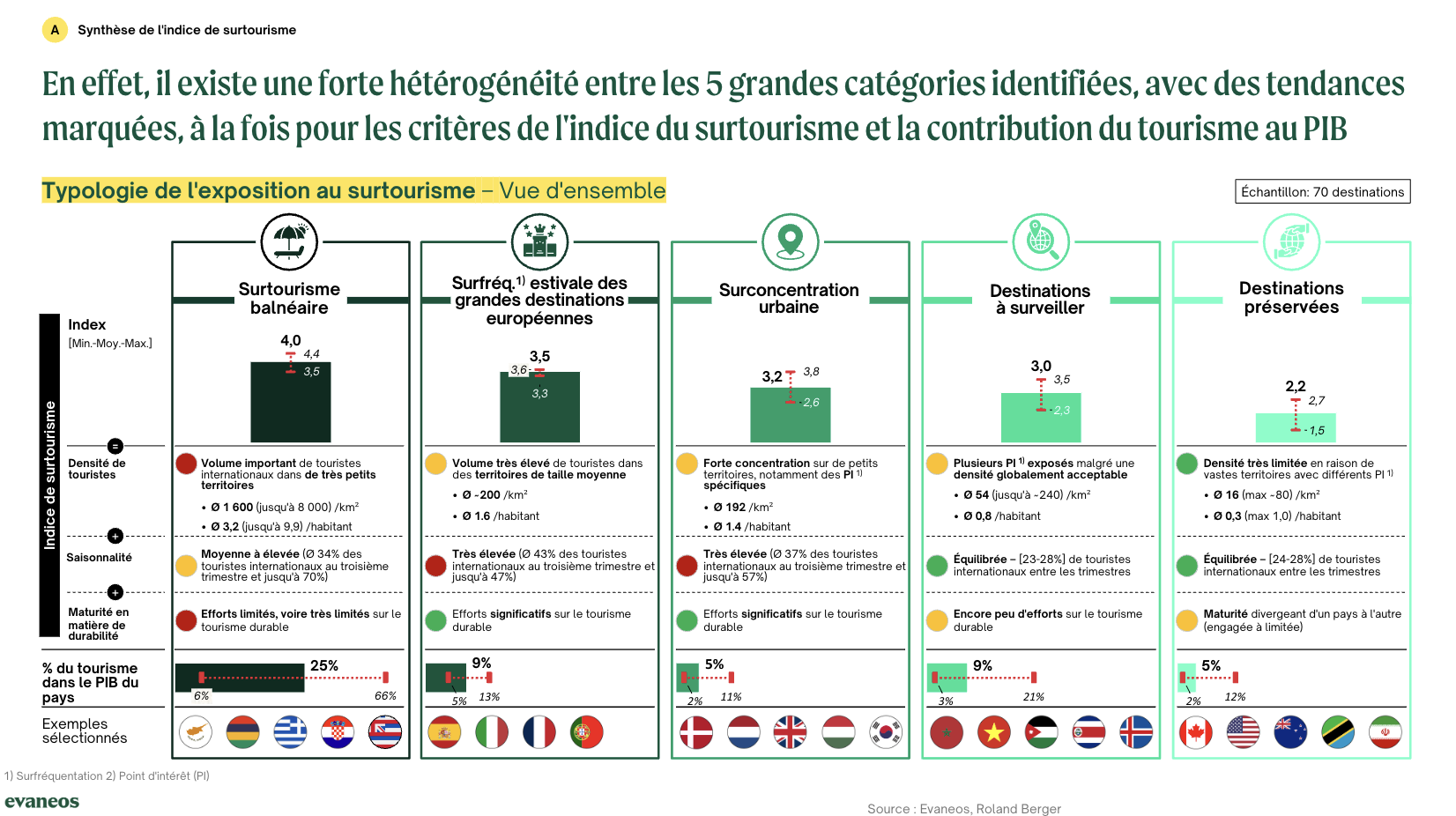 Parmi les destinations étudiées, l'impact du surtourisme varie selon 3 grands types d’exposition. Ainsi, le surtourisme balnéaire, la surfréquentation estivale desgrandes destinations européennes, la surconcentration urbaine sont les trois catégories à risque identifiées par l’index. A cela s'ajoutent les destinations “à surveiller” qui nécessitent la mise en place d’actions préventives et celles qui sont encore préservées du tourisme de masse.